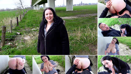 Either she was totally naive, or she was asking for it! While looking for a hot bareback outdoor fuck, I suddenly meet this hot BBW slut. She said that she lost her bracelet while jogging and is now looking for it. Of course, I help her with the search, and when we are behind a bridge pillar, I simply take out my cock in front of her and start jerking off. Even though she has a boyfriend, she immediately kneels on the ground and gives me a hot blowjob. After I fucked her deepthroat in the mouth, she presents her plump Big-Ass to me and lets herself be fucked doggystyle without a condom. I fuck her wet pussy thoroughly and then pull my cock out of her cunt and shoot my cum directly into her hot mouth. She couldn't swallow the big load of cum fast enough, so some of the cum also dripped onto her huge natural tits.